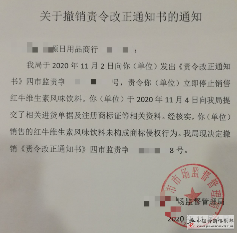 快消君获取的盖有有市场监管部门公章的材料显示,10月29日保全裁定出来的当日,多地市场监督管理局曾以“涉嫌经营其他足以引人误认为是他人商品或者与他人存在特定关联的混淆行为”为由,责令卖场下架、停止销售红牛维生素风味饮料、红牛安奈吉饮料;但从11月初,即上述责令被出具的第二天开始,相关责令被一一纠正并撤销,天丝授权产品的销售逐渐恢复正常。
