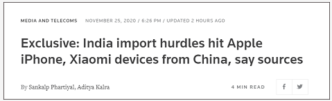 两名知情人士告诉路透社,印度政府此举原是严格控制来自中国的电子产品,但却影响了苹果公司新型iPhone手机的进口,导致新发售的iPhone 12在上个月遭遇通关延误。目前,苹果印度公司高管呼吁印度标准局加快审批速度,并保证公司将继续扩大在印度的组装业务。