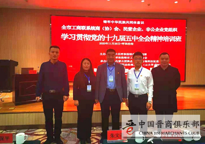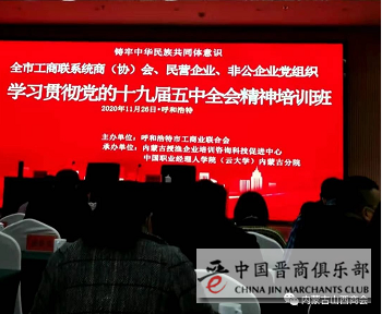2020年11月26日,商会常务副会长、党支部书记李守效,副秘书长秦香丽、王新华、吴楠,监事刘鹏飞赴呼和浩特市海景国际大酒店参加了由呼市工商联举办的的全市工商联系统商(协)会、民营企业、非公企业党组织学习贯彻党的十九届五中全会精神培训班。