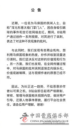 11月28日,@哔哩哔哩弹幕网 发布公告:为纠正有些商业机构想利用马保国现象的热度,炒作并收割流量进行谋利。自即日起将严格限制、审核、管理马保国相关视频内容。