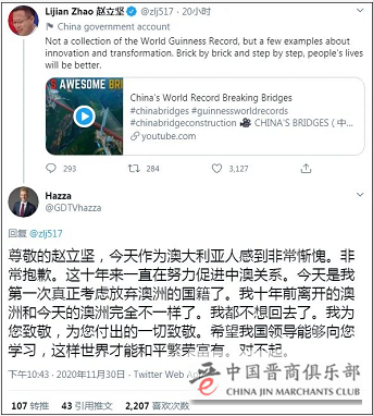 尊敬的赵立坚,今天(我)作为澳大利亚人感到非常惭愧。非常抱歉。这十年来一直在努力促进中澳关系。今天是我第一次真正考虑放弃澳洲的国籍了。