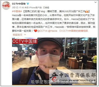今年3月,@CCTV中国缘 发布视频“歪果仁的抗‘疫’vlog:辗转万里,澳洲小伙只为回广州工作”。原来,2月6日,Hazza就从澳大利亚出发返回广州工作,口罩上还写着“中国加油!”