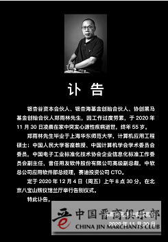 昨日晚间传来一则讣告,银杏谷资本合伙人、银杏海基金创始合伙人、协创黑马基金创始合伙人郑雨林先生,因工作过度劳累,于11月30日凌晨在家中突发心源性疾病逝世,终年55岁。