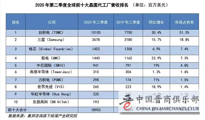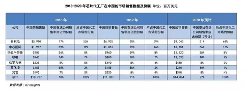 中芯国际是中国大陆最大的芯片代工厂,也是目前中国大陆唯一能够量产14纳米芯片的芯片制造厂商。根据第三方市场调研机构IC Insights预测,2020年中芯国际占据中国代工市场的份额为16%,是中国大陆代工厂中最高。第三方市场调研机构集邦咨询旗下拓墣产业研究院对全球代工厂2020年二季度数据调查显示,中芯国际在这一阶段的市场占有率为4.8%,排名全球第五。