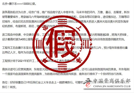 近日,有读者在上海网络辟谣后台留言询问“北京-墨尔本要建高铁”的消息是否属实。