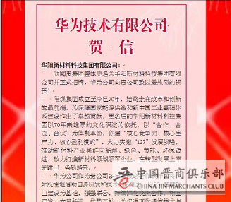 2020年11月 华为技术有限公司发来贺信,祝贺华阳新材料科技集团正式揭牌,衷心祝愿集团蒸蒸日上,再创辉煌。