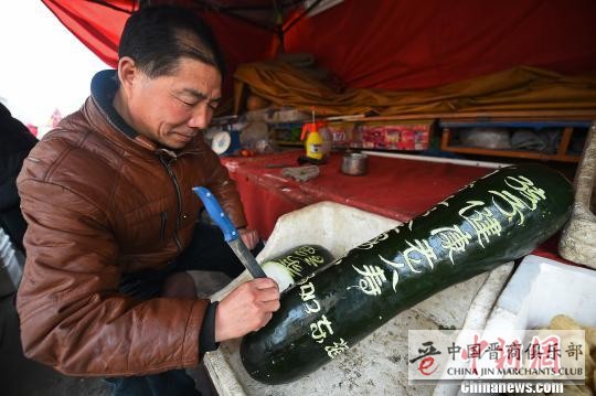 核心提示:3月17日,山西太原,卖菜摊主杨全保在冬瓜上用水果刀雕刻祝福语,并可以根据买家心愿进行私人订制。杨全保刻在冬瓜上的字体自成一派,创意独特受到民众欢迎.