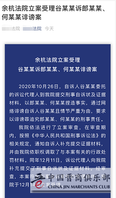 12月14日下午,浙江杭州余杭区人民法院官方微信公众号发布,杭州女子吴思琪(化名)诉郎某、何某诽谤案已被余杭法院立案受理。