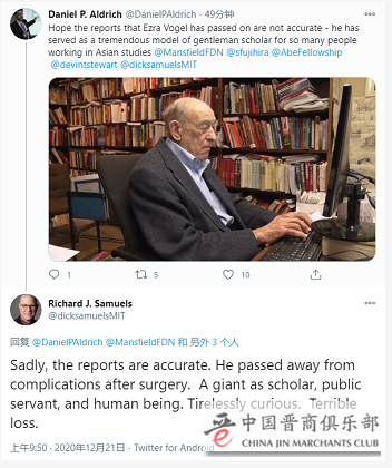 “(傅高义)作为学者、公仆和人类,是一个巨人。(他)不知疲倦地保持好奇心。(他的离世)是巨大的损失。”塞缪尔斯写道。