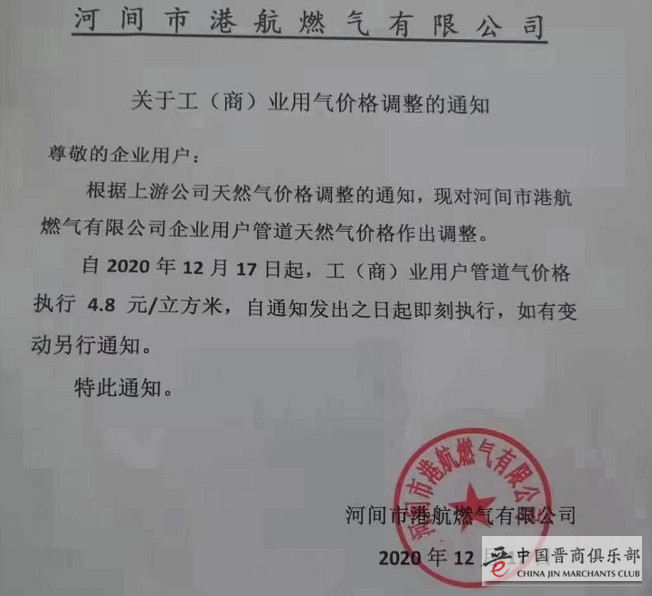河北涿州市发展和改革委员会发布通知,非居民用管道天然气销售价格由3.13元//立方米上调至3.57元//立方米。河北沧州河间市港航燃气有限公司企业用户管道天然气价格作出调整,自2020年12月17日起,工商业用户管道气价格执行4.8元/立方米。河南南阳淅川县龙城天然气责任有限公司发布通知,自2020年12月14日上午08:00起:居民用户天然气销售价格由4.30元/立方米调整至5.80元/立方米;工业、商业(含公福)用户天然气销售价格由5. 00元/立方米调整至6. 50元/立方米。