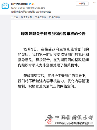 针对全国扫黄打非办公室的点名通报,21日晚间,@哔哩哔哩弹幕网 发布关于持续加强内容审核的公告。公告称,网站第一时间接受监管部门的批评和指导意见,积极配合整改,后续将不断加强内容审核能力,优化内容管理机制,积极营造风清气正的网络空间。