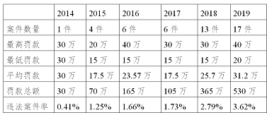对未依法进行申报予以处罚,是反垄断执法机关的法定职责,也是加大反垄断执法力度,依法行政的必要手段。根据笔者的统计,截至2019年12月31日对未依法申报予以行政处罚的案件共计47件,自2014年至2019年公开处罚案件的数量逐年增加,平均罚款金额逐年提高(见下表)。