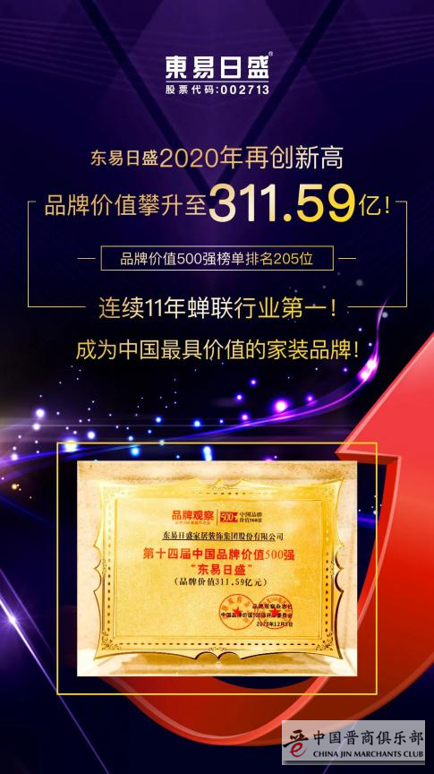 东易日盛2020年再创新高,品牌价值攀升至311.59亿!品牌价值500强榜单排名205位,连续11年蝉联行业第一!成为中国最具价值的家装品牌!为2020年产业进程书写一份满意的答卷,为企业变革和品牌升级创造更多的价值。