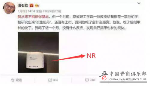 在网上搜索“NMN”,能看到很多文章都傍名人如巴菲特、李嘉诚、潘石屹等。例如,把潘石屹发过的一条微博贴出来,就说成他在吃NMN,事实上非也,从他的配图来看,那是NR,而非NMN。还有商家宣称“李嘉诚投资NMN”,事实上他投资过的也是NR。而“巴菲特投资NMN”,由于没有找到明确的证据,笔者对此持怀疑态度。