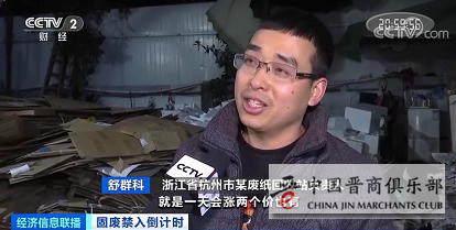 浙江省杭州市某废纸回收站负责人舒群科:有些时候一天会涨两个价,基本上每吨30元-50元之间,每个家庭都不舍得扔了,基本都到我们收购站里来了。