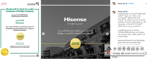据了解,“消费者友好型企业”评选是迪拜政府为提升消费者体验和商家服务质量而设立的。根据各行业平均水平,迪拜经济部设立了11项评估标准,最终得分通过率只有30%。中国品牌海信在参评的300多家企业里表现优异,在售前体验、产品质量保证以及投诉解决效率评分均高于行业平均分,与三星、宜家等品牌共同获评“消费者友好型企业”。