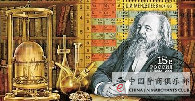 ↑门捷列夫纪念邮票,背景为其发明的化学元素周期表