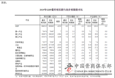经最终核实,2019年,GDP现价总量为986515亿元,比初步核算数减少了4350亿元;按不变价格计算,比上年增长6.0%,比初步核算数下降0.1个百分点。