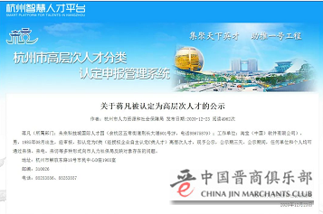 一周前(12月23日),杭州智慧人才平台公示,经审核,拟认定蒋凡为C类(经授权企业自主认定C类人才)高层次人才,公示期三天。