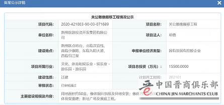 据湖北省投资项目在线审批监管平台显示,荆州区发展和改革局2020年12月17日批复的“关公雕像搬移工程”已审核通过,项目总投资为15500万元,计划开工时间为2021年1月。该工程主要建设规模及内容包括:雕像用地面积约50亩,像体铜片拆除及异地安装;像体内骨架拆除;原址基座及广场修整;关公基座及像体骨架重建;新址广场及景观工程。