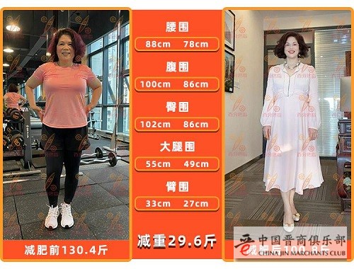 本文主人公黄女士,在百分燃脂减肥前的体重为130.4斤,腰围为88cm,腹围为100cm,减肥后的体重为100.8斤,总减重29.6斤,腰围缩小10cm,腹围缩小14cm。