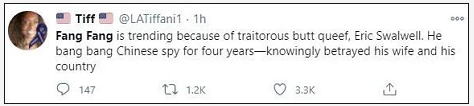 然而,斯沃韦尔这番操作将美国网民的关注点带偏,使得所谓“中国女间谍方芳(Fang Fang)”的话题冲上推特热搜。此前,美媒曾大肆炒作斯沃韦尔私通“中国女间谍”。