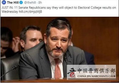 当地时间1月2日,美国11名共和党参议员联合发表声明宣称,将在1月6日当天反对国会认证选举人团的投票结果。