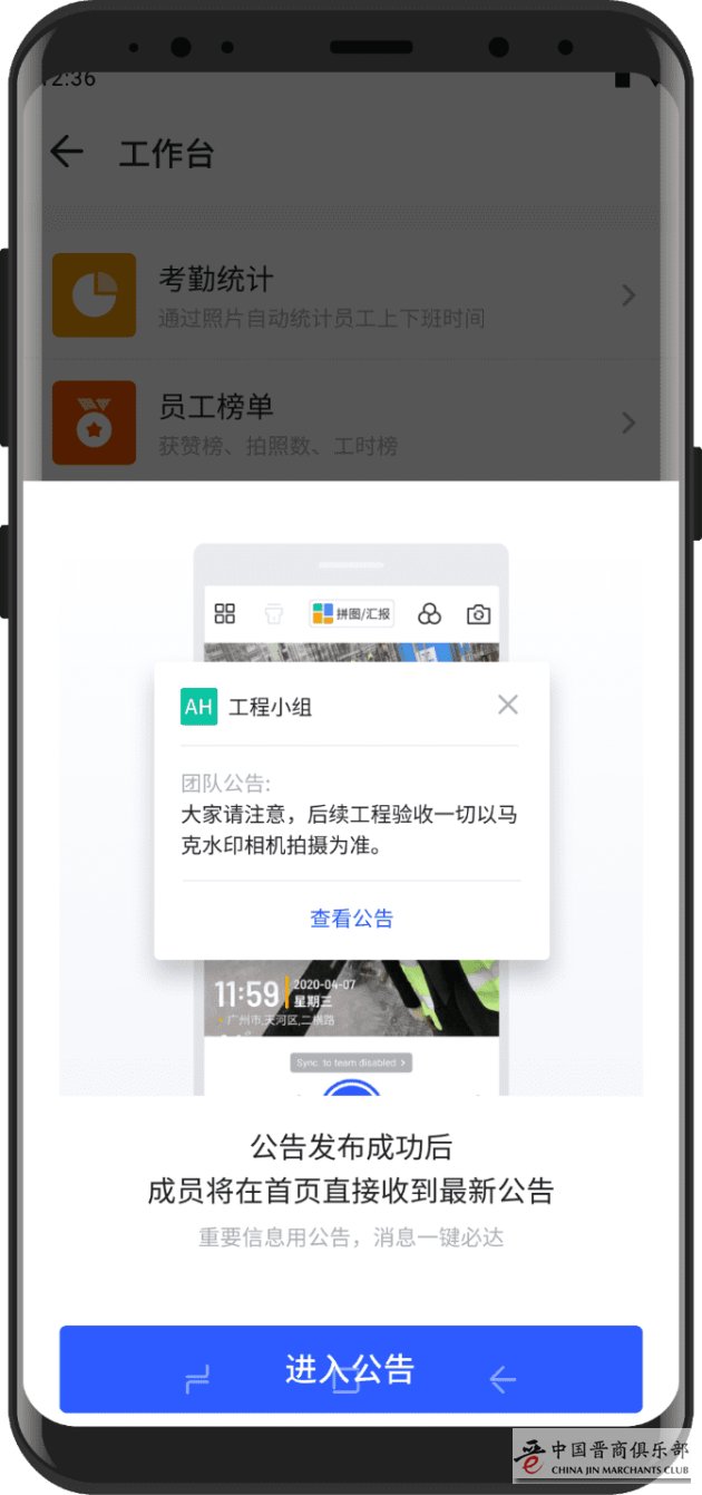 马克水印相机拥有丰富便捷的创新物业团队交流方式。内置通知一键传达、团队圈实时查看工作照片等功能,助力物业团队沟通管理效率的提升,符合信息化发展的时代要求。