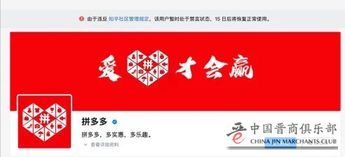 1月5日,根据网友爆料,知乎网页显示,由于违反知乎社区管理规定,拼多多的知乎官方账号被禁言15天。