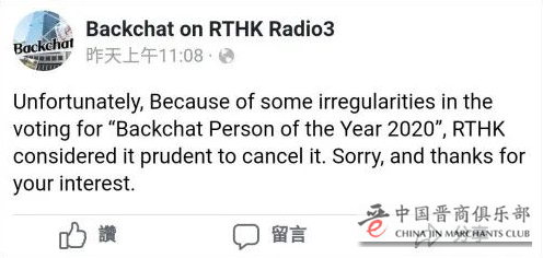 综合香港媒体报道,香港电台主持人Hugh Chiverton 4日上午在其主持的节目《Backchat》称,因为注意到有异常投票“涌入”,因而取消所谓“年度人物”的评选。