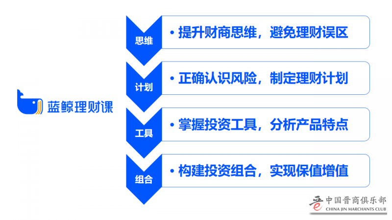在互联网金融时代,各式各样的理财商品层出不穷,投资者需要根据自身的风险承受能力及资产规模、收益需求等选择适合自己的理财产品,只有合理的进行资产配置并规避风险,才能让收益最大化。蓝鲸理财课从实操出发,致力于帮助用户提升财富管理能力,制定科学可行的资产配置方案。未来,蓝鲸理财课还将继续开发多层次的课程内容,多样化的教育形式,全面推进国民金融普惠教育,提高国民的金融素养。