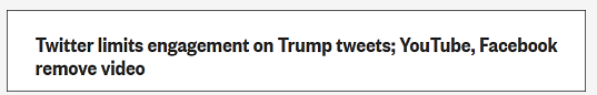 声明中还说,使用暴力的威胁和呼吁违反了推特规定,“我们正相应地执行我们的政策”。此外由于存在暴力风险,“我们一直在严格限制参与我们政策下的推文,这意味着贴有这些标签的推文将无法被回复、转发或点赞”。