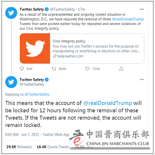特朗普支持者涌入华盛顿特区,暴力冲击国会大厦的同时,特朗普仍不断在社交媒体上反复煽动。出于对“暴力风险”的担忧,当地时间1月6日,推特采取了非同寻常的措施:先是限制用户转发和回复特朗普发布的一段宣扬选举欺诈阴谋论的视频,之后还相继删除了3条特朗普的推文,随后又称将冻结特朗普账户12小时。脸书很快跟进,称将冻结其账号24小时。