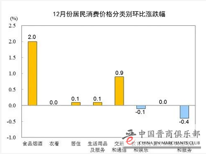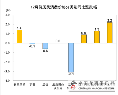 从同比看,12月份CPI由上月下降0.5%转为上涨0.2%。其中,食品价格由上月下降2.0%转为上涨1.2%,影响CPI上涨约0.26个百分点。扣除食品和能源价格的核心CPI同比上涨0.4%,涨幅比上月回落0.1个百分点。从环比看,CPI由上月下降0.6%转为上涨0.7%。其中,食品价格由上月下降2.4%转为上涨2.8%,影响CPI上涨约0.62个百分点。