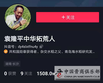 今天,抖音平台出现账号“袁隆平中华拓荒人”,其认证信息为“共和国勋章获得者、杂交水稻之父青岛海水稻研究发展中心主任”,账号开通不久粉丝即破千万。