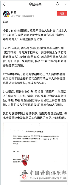 2.2020年10月,青岛海水稻中心工作人员向抖音提供了袁隆平授权函和袁隆平本人身份证信息等认证必需资料,完成实名认证。