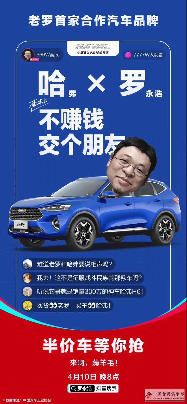 4月,“初代网红”罗永浩的汽车直播首秀就选择了长城汽车,“哈罗组合”的海报生动有趣,让哈弗F7这一网红车型热度持续攀升,预估销售额15.65亿。