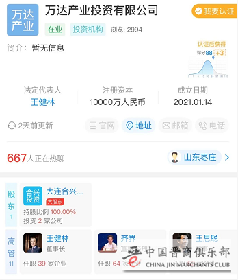 近期,资料显示,万达产业投资有限公司成立,注册资本1亿元人民币,法定代表人及最终受益人为王健林,王思聪为董事,公司经营范围包括以自有资金从事投资活动、企业总部管理、财务咨询等。