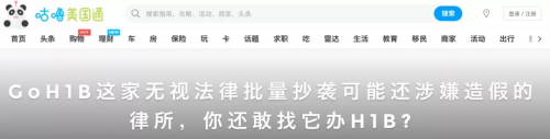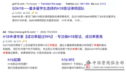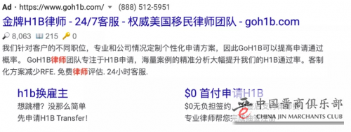 不管你用Google搜索“H1B”,“工作签证”还是“移民律师”,GoH1B的网站都是最靠前的网站,说自己是“金牌团队”,打出“0元首付”的吸引眼球的广告。