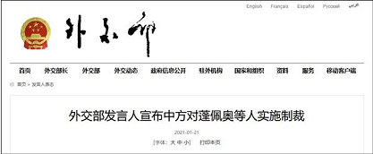 外交部网站1月21日消息,外交部发言人宣布中方对蓬佩奥等人实施制裁:
