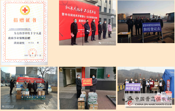 今年疫情爆发后,为支援抗击新型冠状病毒疫情,山西聚义实业集团第一时间通过晋中市工商联向晋中市红十字会捐款50万元,向晋中市红十字会、吕梁市交城县工商联、灵石县红十字会捐赠15万元的抗疫物资。同时,聚义集团向全社会发起了新冠肺炎防控专项基金筹款活动,公司职工、职工家属以及社会各界爱心人士纷纷伸出援手,筹集专项善款近10万元。