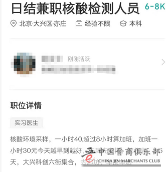对于各机构来说,检测物资的采购渠道、检测人员的招聘和组建等等,都在初期形成了较高的机会成本。BOSS直聘等招聘平台信息显示,大量机构正在招聘日结核酸检测人员。有应聘者表示,在检测高峰期,相关薪酬还会更高。