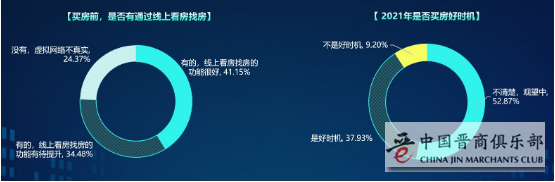 在粤港澳大湾区“9+2”城中,购房人群最看好的城市是深圳,占比25.57%,其次是广州,占比18.15%。购房人群买房考虑的因素较多,相对价格、户型、开发商品牌口碑,更加注重生活配套、交通、环境、学校。值得关注的是,购房人群中,近4成购房者认为2021年将是买房的好时机,并且在买房前,通过线上看房找房的占比75.63%,认为线上看房找房的功能很好占比较高,占比41.15%。