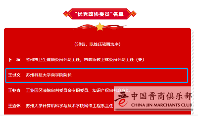 会上, 苏州市山西商会(中国晋商俱乐部联合发起机构)会长、苏州新晋源食品科技有限公司董事长 张新,名誉会长、苏州东壹元集团有限公司董事长 郭进林,参事、苏州科技大学商学院院长 王世文 被评为“优秀政协委员”。
