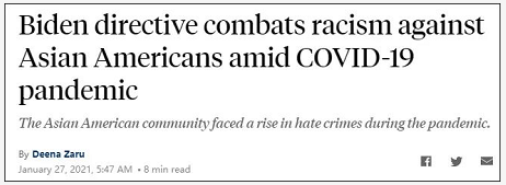 据美国广播公司(ABC)新闻网站1月27日报道,当地时间26日,拜登签署一份备忘录,指导联邦机构打击针对亚太裔社区的仇外情绪。新冠疫情期间,美国相关仇恨犯罪和骚扰事件有所上升。