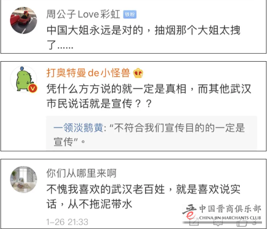 中国网友则纷纷为视频中的两位武汉市民叫好:“不愧是武汉老百姓,就是喜欢说实话,从不拖泥带水”,“凭什么方方说的就一定是真相,而其他武汉市民说话就是宣传?”
