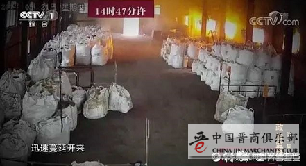 这种黄色粉末就是爆炸的元凶,它是天嘉宜公司在生产过程中产生的硝化废料,是应当及时处置的危险废物,一旦失水干燥就非常易燃易爆。天嘉宜公司明知其危险性,却为了节省每月100万元的处理费用,长达七年里陆续将大量硝化废料违法储存。爆炸的仓库里大量硝化废料长期堆积,自分解产生的热量无法散出,温度逐渐爬升,最终导致自燃。监控视频记录下事发一刻:硝化废料所在的仓库先是冒出大量白烟,继而局部起火,迅速蔓延开来,发生爆炸。