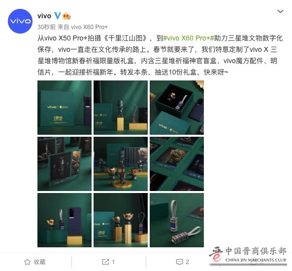 作为一直对传统文化和历史传承非常重视的企业,vivo一直致力于这方面的工作,从去年的vivo X50 Pro+一亿像素重现《千里江山图》,再到今年的vivo X60 Pro+走进三星堆博物馆,vivo数字国宝助力计划希望能给大家带来更加愉悦的体验与感受。春节临近,定制版vivo X 三星堆博物馆新春祈福礼盒正式曝光,表达着喜庆祥和祝福的同时,也传达着vivo对于文化和传承的品牌理念。