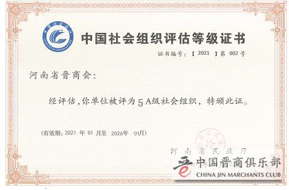 经河南省民政厅公开选取第三方评估机构专家组现场审核,网上公示,近日,河南省民政厅下发了《关于2020年度全省性社会组织评估等级结果的公告》,河南省晋商会(中国晋商俱乐部联合发起机构)被评为5A级社会组织。