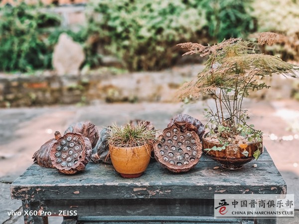 自然枯萎的莲蓬与陶盆中仍在新生的绿植